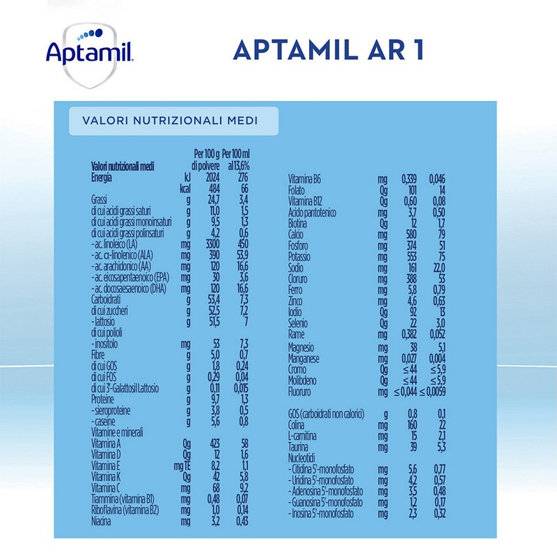 La ricostituzione Aptamil AR1 è al 13,6% e la si ottiene aggiungendo l misurino raso di polvere (4,6 g circa) ogni 30 ml di acqua bollita. Utilizzare esclusivamente il misurino contenuto nella confezione.