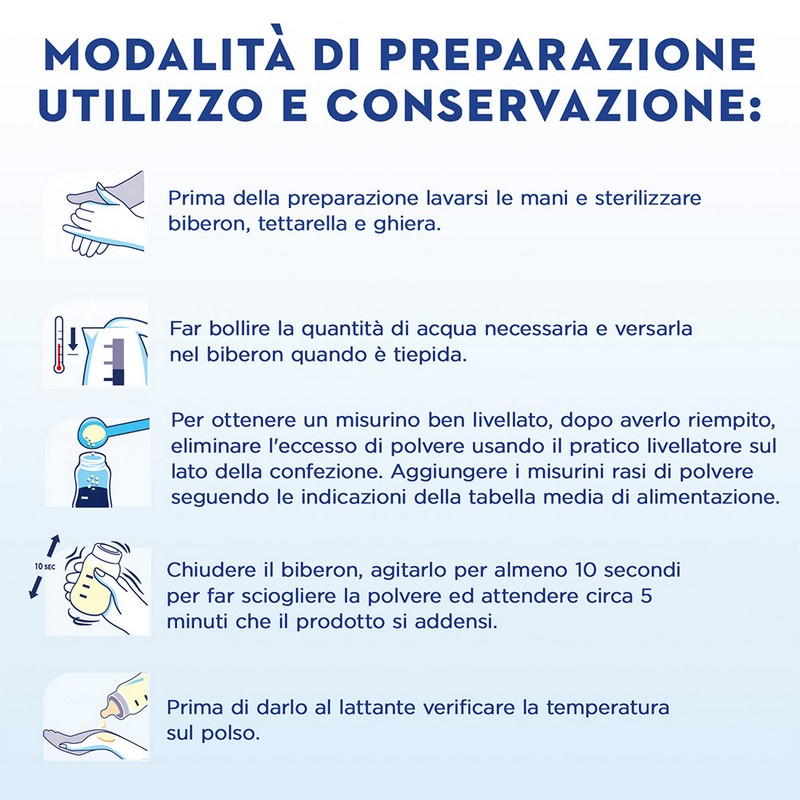 Seguire con cura le indicazioni: una preparazione e modalità di conservazione inadeguate potrebbero comportare un rischio per la salute del lattante.