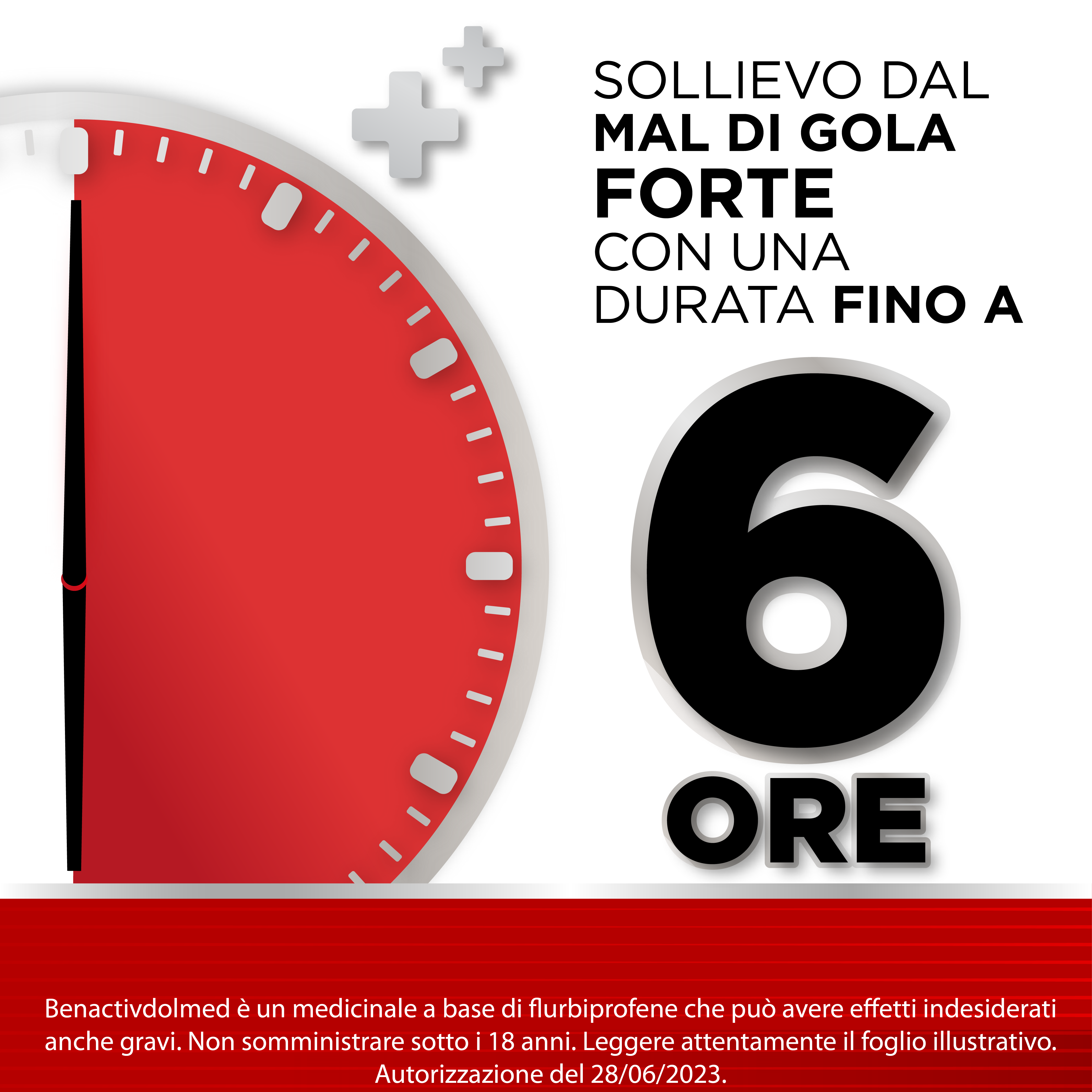 Spray per il mal di gola forte ad azione antinfiammatoria indicato per il trattamento del dolore acuto nel mal di gola degli adulti sopra i 18 anni di età. Benactivdol Gola Spray contiene flurbiprofene. Il flurbiprofene appartiene ad un gruppo di medicinali chiamati Farmaci Anti-infiammatori Non Steroidei (FANS). Questi medicinali funzionano modificando la risposta del corpo al dolore, al gonfiore e alla febbre. Lo spray per il mal di gola della linea Benactivdol Gola è dedicato al trattamento di breve durata dei sintomi legati all'infiammazione e dolore della gola, gonfiore e difficoltà a deglutire. Benactivdol Gola Spray contine: Principio attivo: flurbiprofene. Eccipienti: Betadex, Sodio fosfato bibasico dodecaidrato, Acido citrico monoidrato, Metil paraidrossibenzoato (E218), Propil paraidrossibenzoato (E216), Idrossido di sodio, Aroma menta, Aroma ciliegia, N,2,3-Trimetil-2-isopropilbutanamide, Saccarina sodica, Idrossipropilbetadex e Acqua depurata. Si raccomanda l'utilizzo di 1 dose (3 spruzzi) di Benactivdol Gola Spray ogni 3-6 ore, a seconda della necessità, indirizzando l'erogatore spray in direzione della parte della gola interessata dal dolore e dall'infiammazione. Non assumere più di 5 dosi in un periodo di 24 ore. Una dose (3 spruzzi) contiene 8,75 mg di flurbiprofene. Benactivdol Gola Spray è un medicinale indicato per adulti sopra i 18 anni di età.