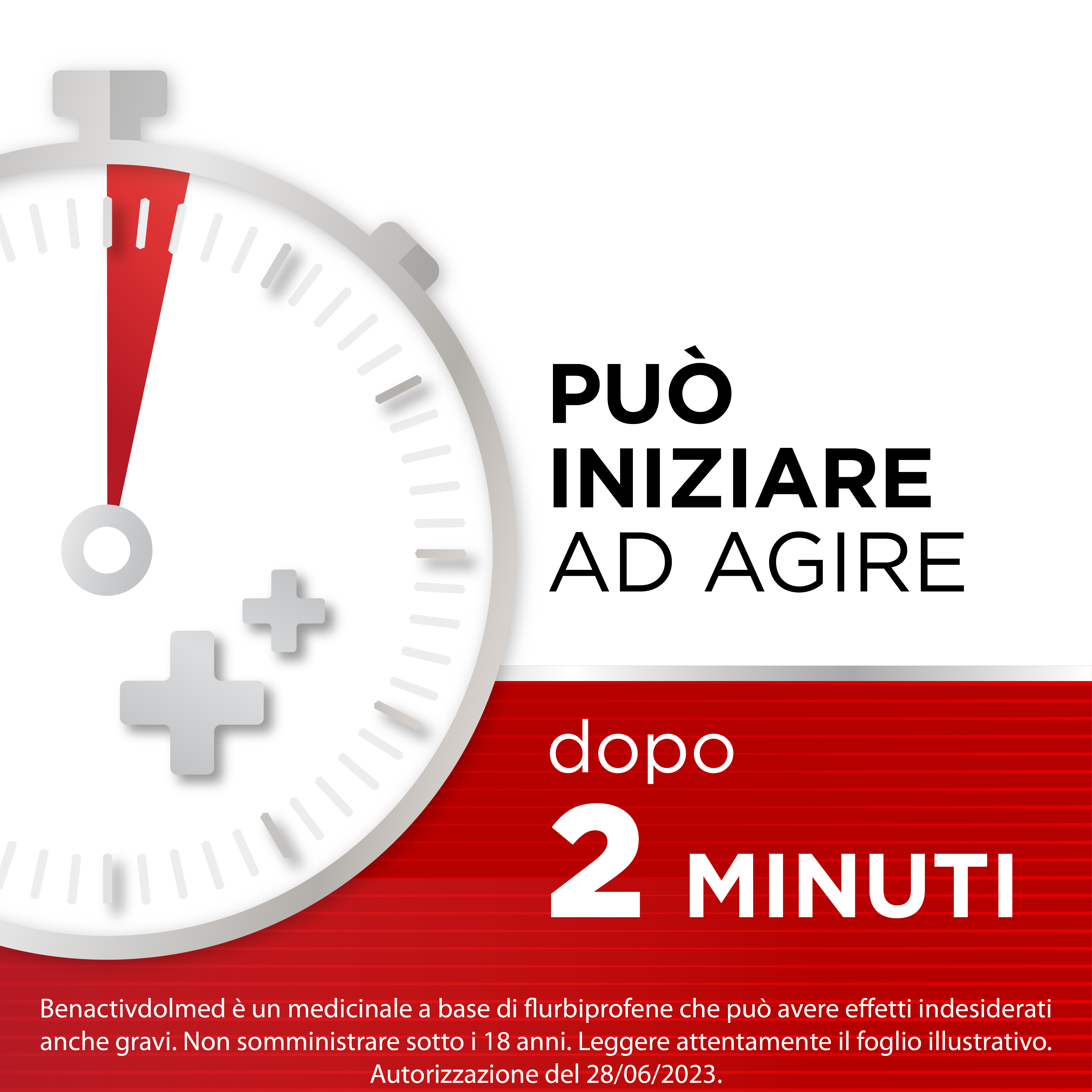 Posologia: Solo per trattamenti di breve durata. Adulti a partire dai 18 anni: una dose (3 spruzzi) somministrata nella parte posteriore della gola ogni 3-6 ore a seconda della necessità, fino ad un massimo di 5 dosi in un periodo di 24 ore. Popolazione pediatrica: La sicurezza e l’efficacia di Benactivdolmed nei bambini o adolescenti di età inferiore ai 18 anni non sono state stabilite. Pazienti anziani: Non può essere fornita una raccomandazione posologica generale, poiché ad oggi l’esperienza clinica è limitata. Gli anziani presentano un aumentato rischio di gravi conseguenze in caso di reazioni avverse. Si deve somministrare la più bassa dose efficace per la più breve durata di trattamento necessaria a controllare i sintomi (vedere paragrafo 4.4). Modo di somministrazione: Per somministrazione oromucosale. Non inalare durante l’erogazione. Questo medicinale deve essere utilizzato per un massimo di 3 giorni. Prima del primo utilizzo, attivare la pompa, puntando l’erogatore lontano dal proprio corpo e spruzzando per almeno quattro volte, fino ad ottenere il rilascio di una nebulizzazione fine e uniforme. La pompa è quindi attivata e pronta per l’uso. Tra un utilizzo e l’altro puntare l’erogatore lontano dal proprio corpo ed erogare una quantità minima di prodotto, al fine di assicurarsi che la nebulizzazione sia fine e uniforme. Prima dell’uso del prodotto assicurarsi sempre che la nebulizzazione sia fine e uniforme.