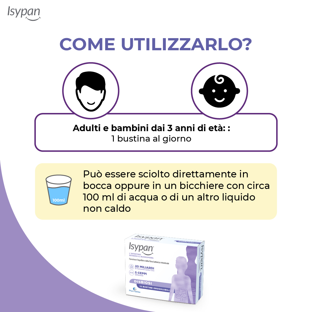 Isypan® Disbiosi è un integratore alimentare utile per favorire il ripristino della flora batterica intestinale. Contiene fermenti lattici, fibre prebiotiche (frutto-oligosaccaridi: FOS Actilight®), succo di carota e edulcoranti.